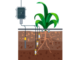 - Hasta 4 tri-sensores de contenido de agua en suelo (VWC: Volumetric Water Content), temperatura y CE (conductividad eléctrica) mediante bus de comunicaciones SDI-12